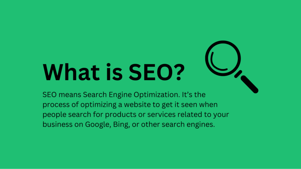 SEO stands for Search Engine Optimization, which means improving your website so it appears higher on Google search results and gets free organic traffic.