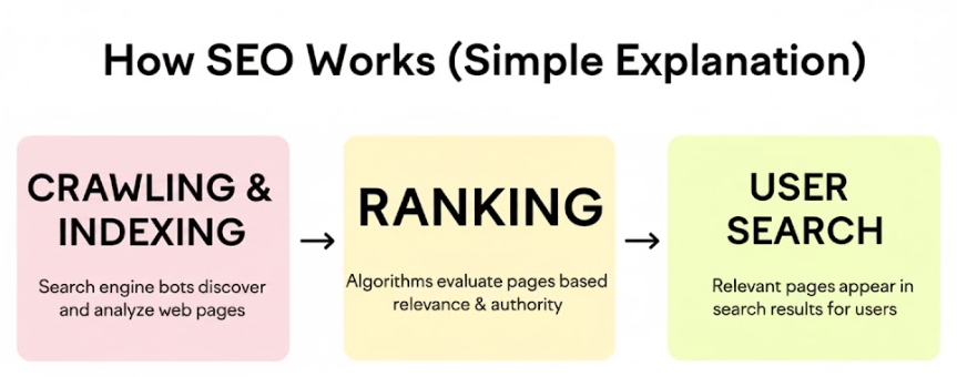 SEO works by helping Google understand your content through keywords, quality writing, backlinks, and a well-optimized website. When Google finds your page useful, it ranks it higher.